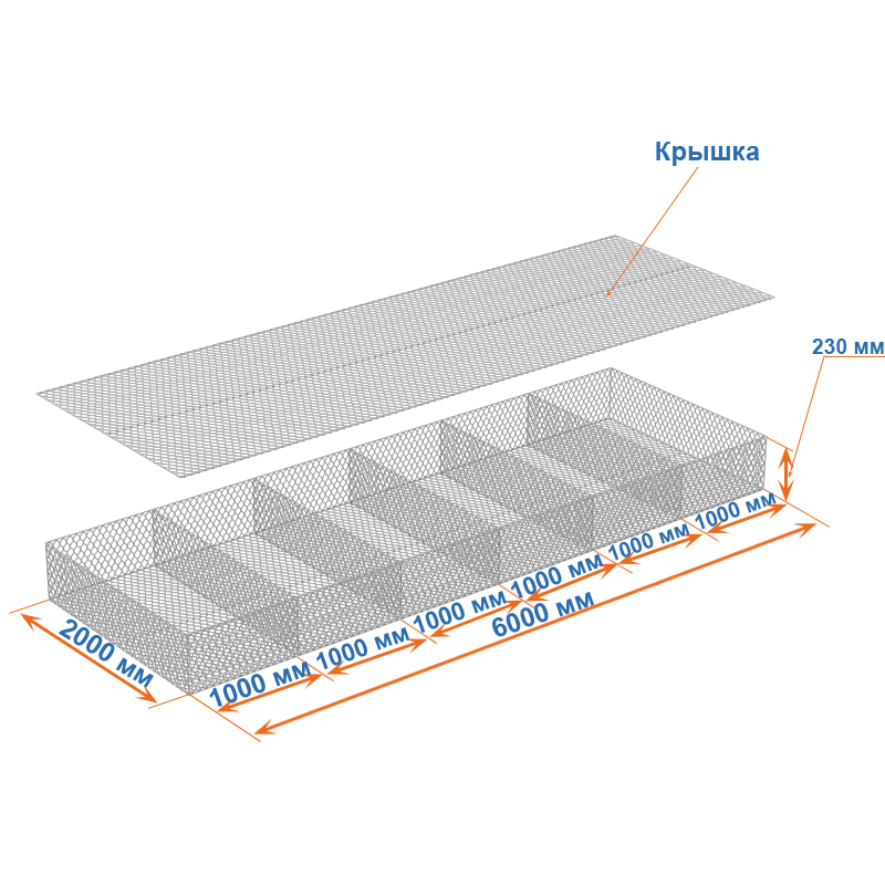 Габион матрац ГСИ-М 6х2х0,23 оцинкованный, Ø проволоки 2,7 мм, размер ячейки 6х8 см